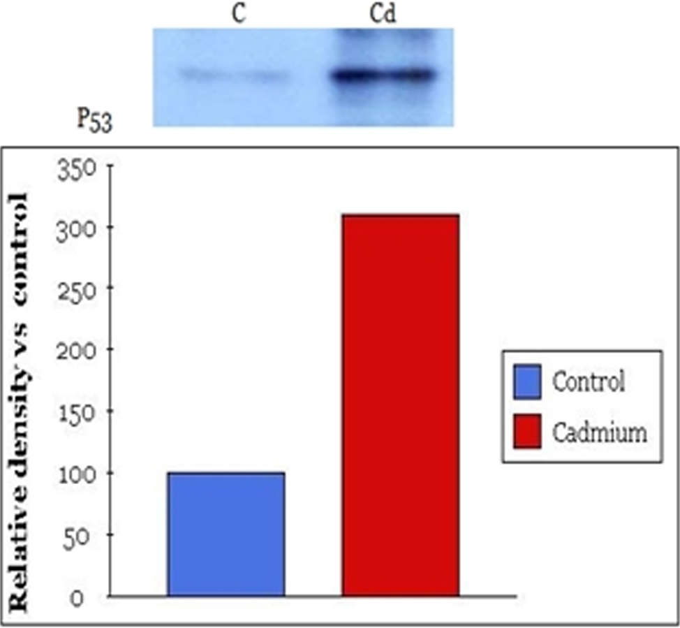 showed that p53 increased after exposure to 60 μM of cadmium chloride. p53 increased 210% in the experimental group as compared