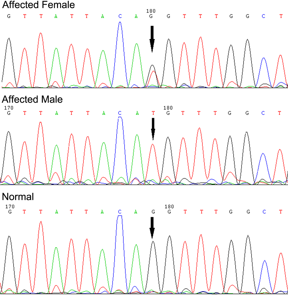 . Sequencing chromatograms are from an affected female patient (top), an affected male (middle), and a normal individual (bottom), showing the c.163–1 G→T transversion.
