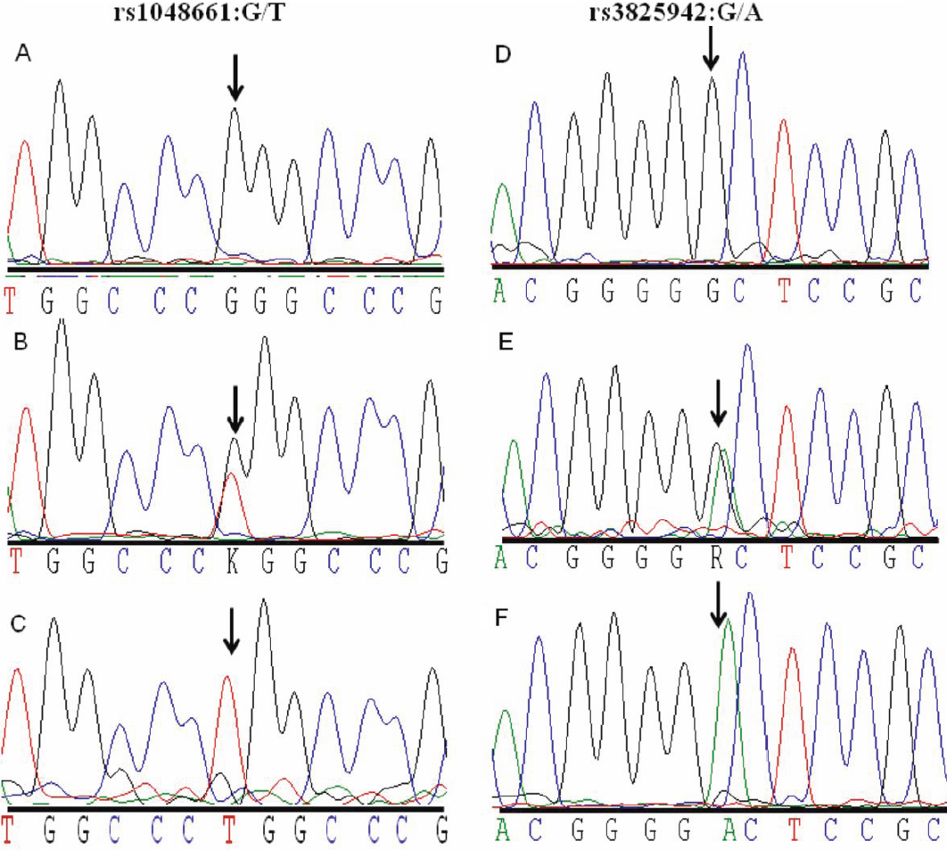 F: Normal (GG), heterozygous (GA), and homozygous variant (AA) sequences for