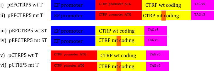 Figure 3. Expression constructs designed for studying expression of pCTRP5 and pCTRP5 promoter activity. Six constructs were made to investigate pCTRP5 expression and putative pCTRP5 promoter activity. The initial vector was pEF CTRP5 wt. All other vectors were based on modifications
