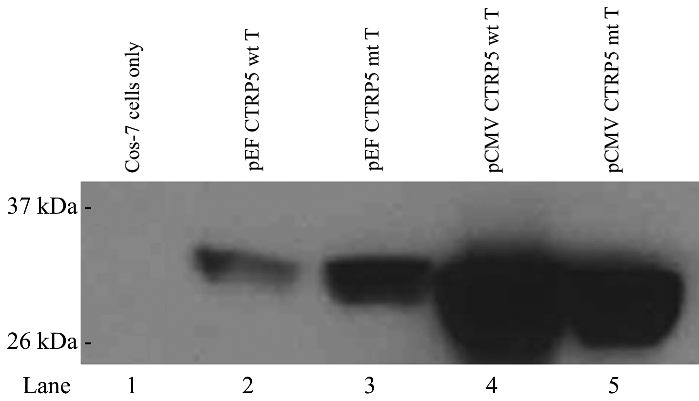 4), pCMV CTRP5 mt T (lane 5), and nontransfected Cos7 cells