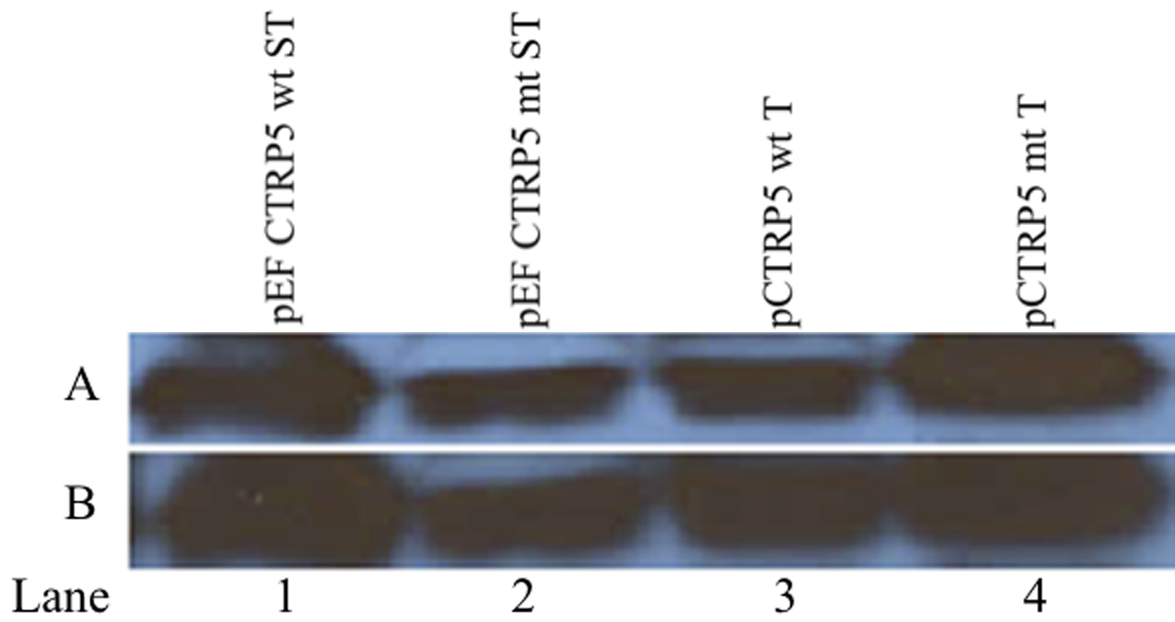 pEF-CTRP5 wt ST (lane 1), pEF-CTRP5 mt ST (lane 2), pCTRP5 wt T