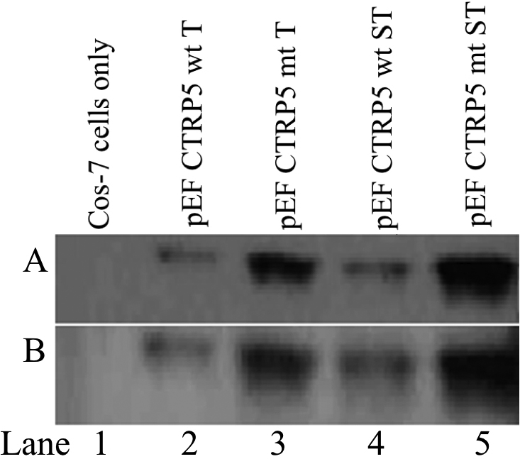 wt ST (lane 4), pEF CTRP5 mt ST (lane 5), and nontransfected Cos-7 cells (lane 1) incubated with anti-CTRP5 polyclonal antibody.