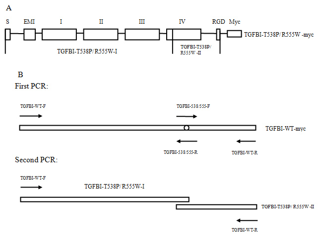 TGFBI-T538P-I: bp 1 to 1613 (the 538 mutant site), TGFBI-R555W-I: bp 1 to 1663 (the 555 mutant site), TGFBI-T538P/R555W-II: from the mutant site to the 3′ end of the sequence. B: The rectangle represents the template DNA, the circle in the rectangle represents the mutant site, and the arrow represents