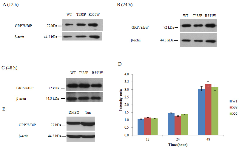 The intensity ratio was calculated by the intensity of the GRP78 band divided by the intensity of the β-actin band (D). No significant differences were found between the mutant and wild-type groups at 12 and 48 h (p>0.05). The intensity ratio