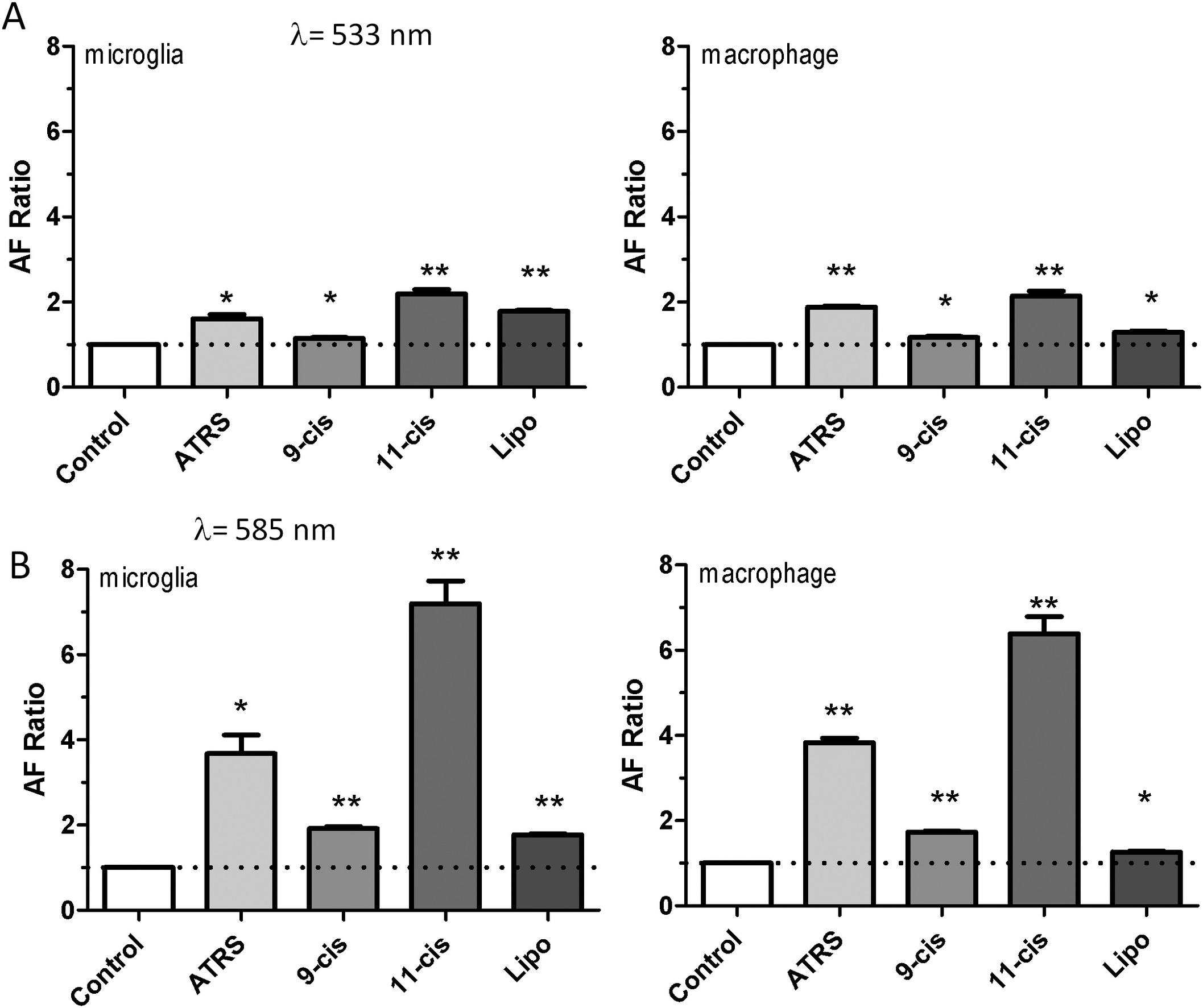 nm) of the microglial cells and macrophage cells fed with