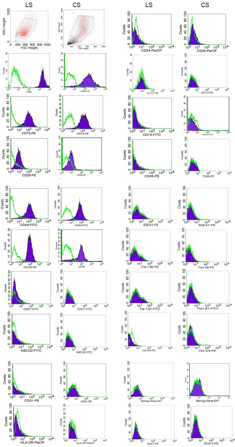 Figure 3. Expression profiles of limbal stromal (LS) at passage 6 and corneal stromal (CS) cells at passage 4 by FACS analysis. The