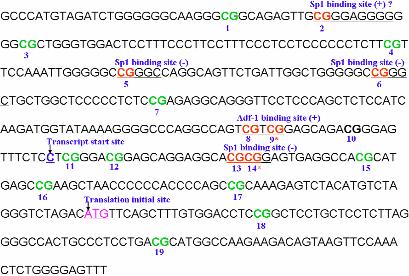 Adf-1 binding site, and site 14 is within the transcription factor Sp1 binding site. Bold numbered cytosine-guanine (CGs)