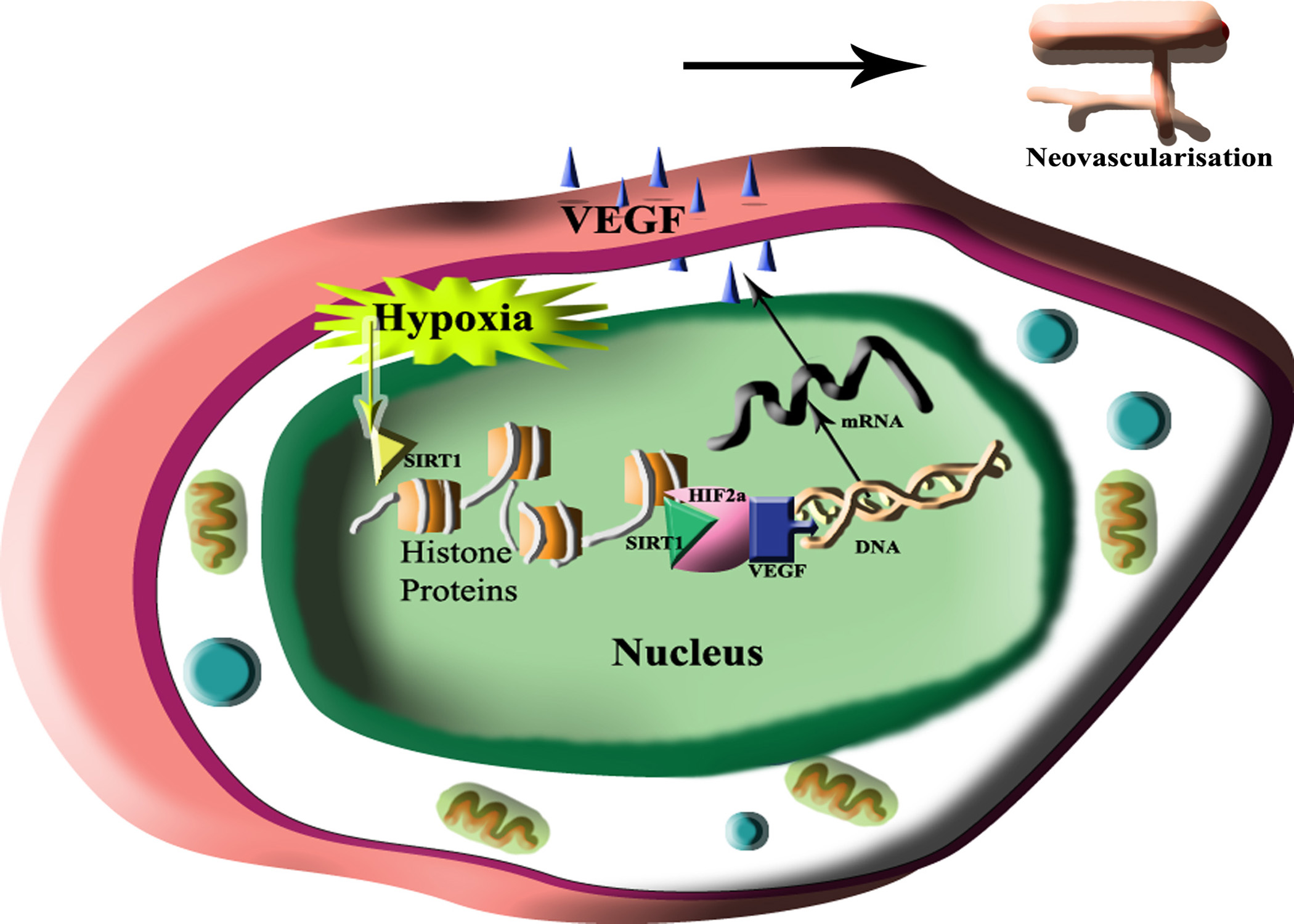 Schematic representation of sirtuin1 role in neovascularisation. During hypoxia sirtuin1 (SIRT1) activates, that binds and transactivate hypoxia inducible factor (HIF)-2α and release vascular endothelial growth factor (VEGF).