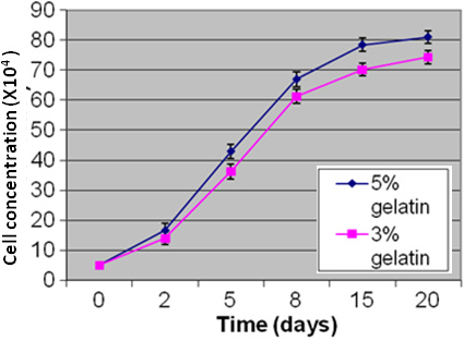 of gelatin (3% and 5% gelatin). The graph shows increased cell concentrations on 15th and 20th. Day of Y79 cell culture on