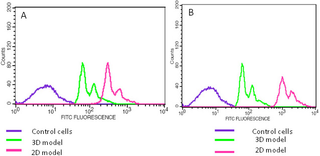 to Y79 cells cultured without microparticles at 4 h. B: Flow cytometry histogram shows decreased uptake of a drug by Y79 cells co-cultured with microparticles (3-D) when compared