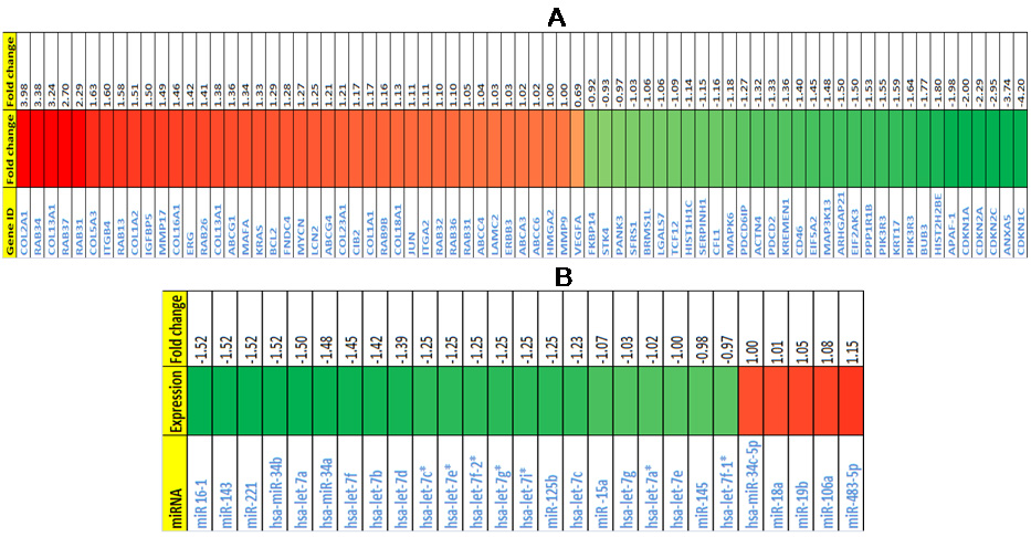and red color represents down-regulated genes or microRNAs. Heat map shows gene IDs or microRNA names and their respective