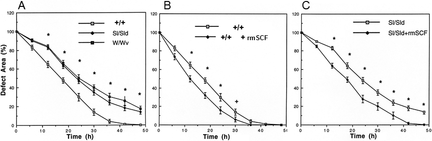topically to the wounded cornea every 6 h in WBB6F1+/+ (B) and SCF mutant mice (C). The difference in the percentage of recovery is significant between WBB6F1+/+ (B) and SCF mutant (C) mice. +/+=WBB6F1+/+ mice, W/Wv=c-kit mutant mice, Sl/Sld=SCF mutant mice. The error bars represent the standard errors (SE) from three experiments. *p<0.01 (paired students’ t test) against WBB6F1+/+ mice or non-administrated controls.