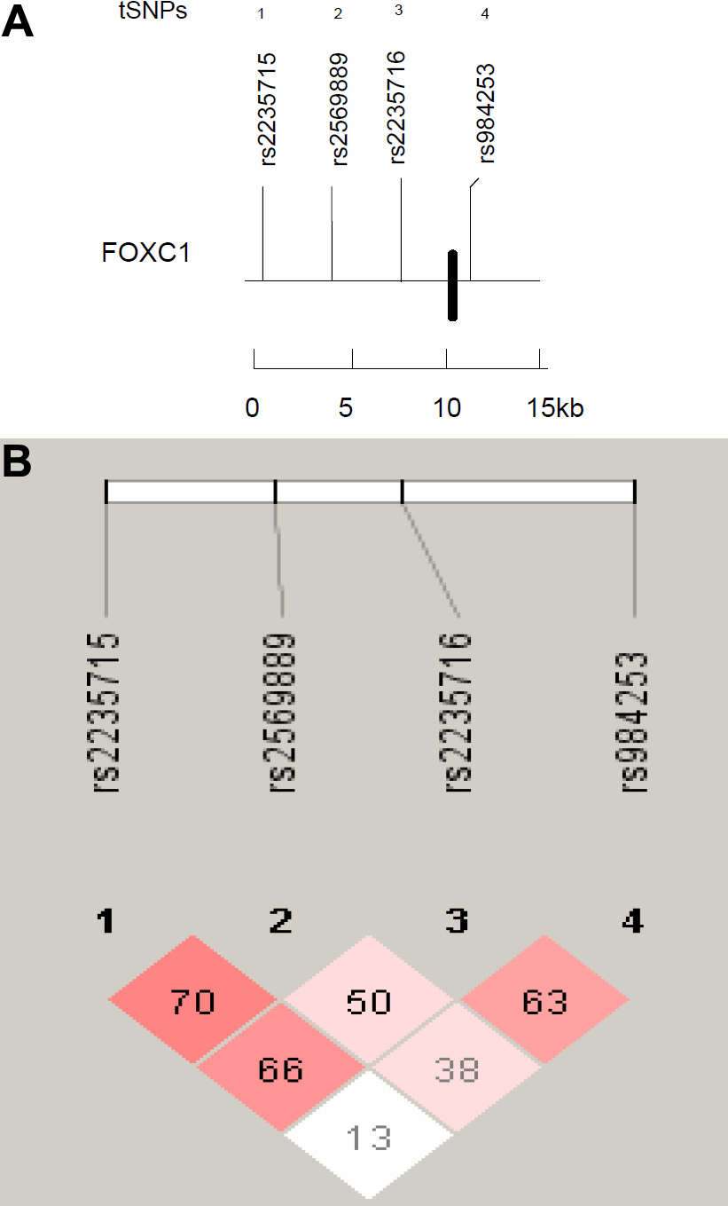 A: The relative position of the remaining 4 tSNPs (labeled above with the respective haplotype) spanning a region of 14,587