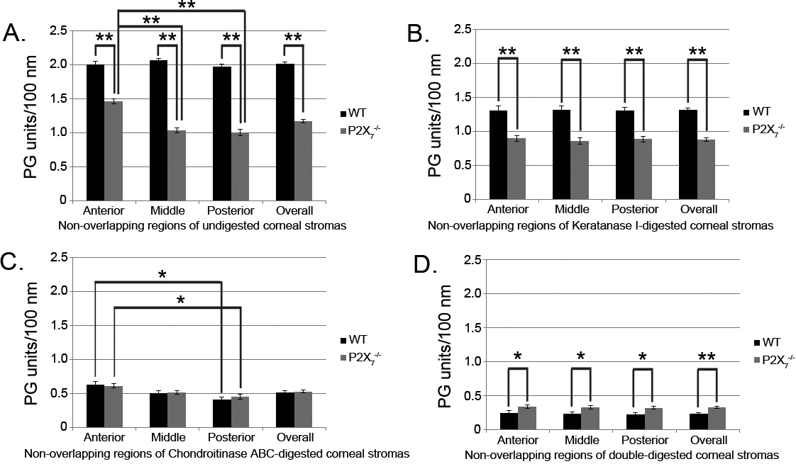 Figure 6. Sulfation of glycosaminoglycans in WT and P2X7−/− corneal stromas. Collagen fibril length was measured, and the number of proteoglycan (PG) units along that length was counted