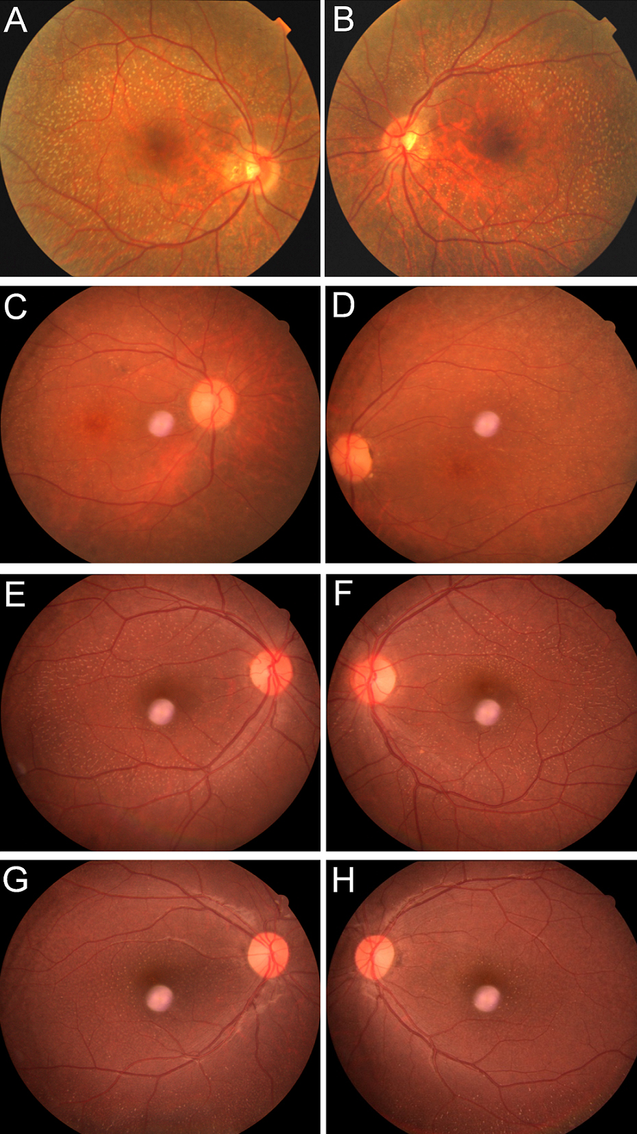 Figure 2. Fundus photographs of affected individuals from both families.