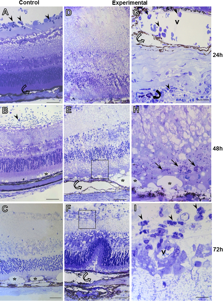 Figure 1. Histopathological analysis of ocular tissues in T. gondii infection. Control group (A-C). Experimental group (D-I). Disruption of normal retina architecture, formation of gaps (*; B, C, E, and H), retinal detachment (hollow curved arrow; A, E, and F) and the presence of inflammatory cells (arrows) in control and experimental groups after 24, 48, and 72 h. Mast cell (filled