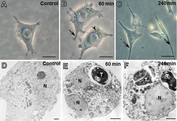 Figure 4. Analysis of ARPE-19 cells after T. gondii infection by light and transmission electron microscopy. Non-infected (control; A) and infected cells after 60 (B) and 240 min (C) with thin and long extensions (arrows). Intracellular parasites (arrowhead). Electron micrograph of control ARPE-19 cells