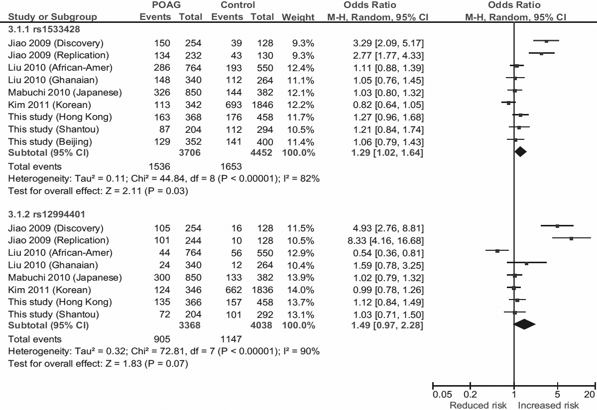 rs12994401 [T] at 2p16.3 with POAG. Squares indicate cohort-specific odds ratio (OR); the size of the box is proportional to the weight