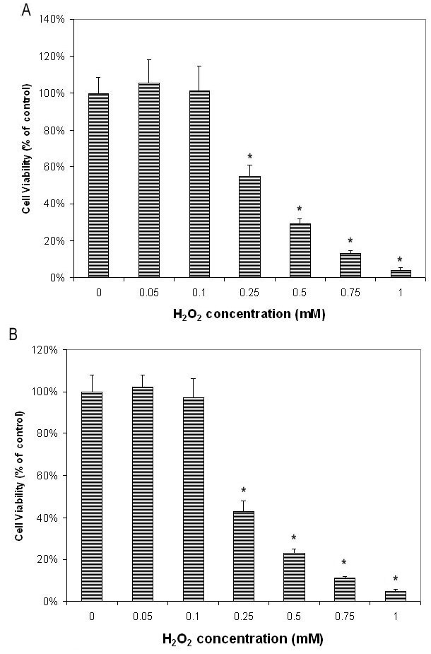 at concentrations from 0.25 mM to 1.00 mM (p<0.05, compared to cells cultured without H2O2. B: Studies of primary cultures of human RPE cells isolated from donor eye showed similar results. *p<0.05, compared with the