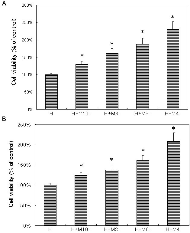 (M) at concentrations of 10−10 M (M-10), 10−8 M (M-8), 10−6 M (M-6), and 10−4 M (M-4). After 24 h, 0.5 mM H2O2 (H) was added and cultured for 24 h. Cells treated with H2O2 alone were used as the controls (H). Cell viability was evaluated by the microculture tetrazoline test and expressed as percentages