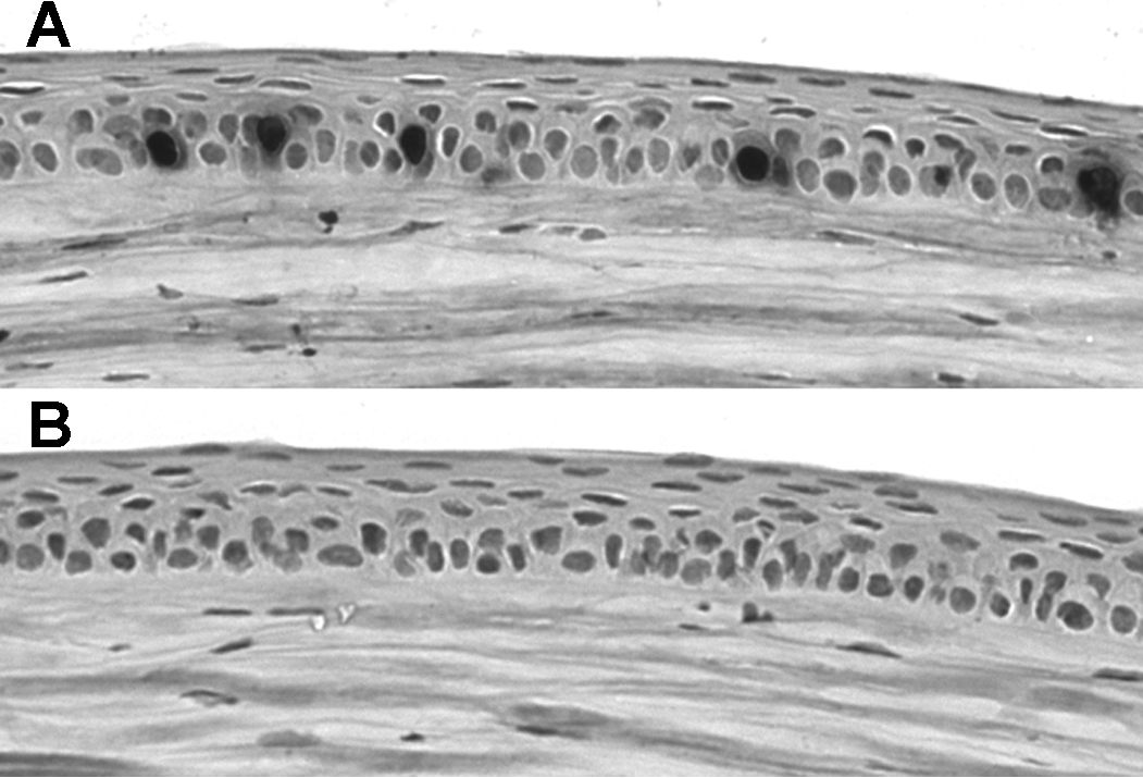 Figure 2. Cyclopamine completely inhibits corneal epithelial proliferation in vivo. A: Immunostaining of corneal epithelium 2 h after injection with BrdU in control mouse injected with vehicle only. Five BrdU-postive