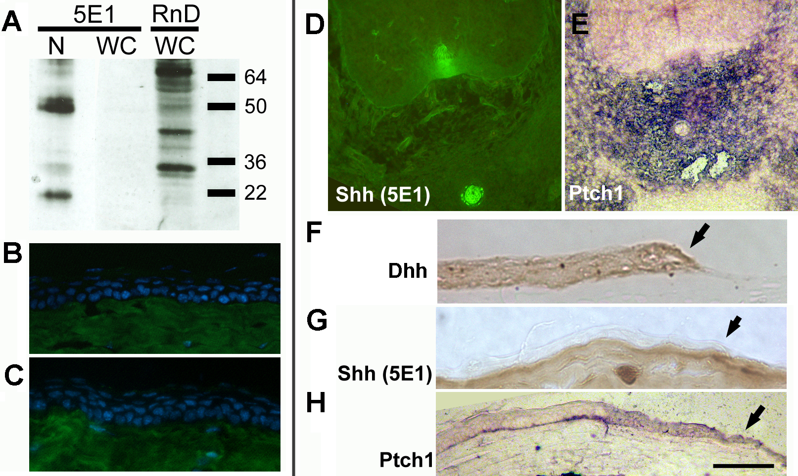 anti-mShh-N polycolonal AF464. 5E1 recognizes 2 major bands at