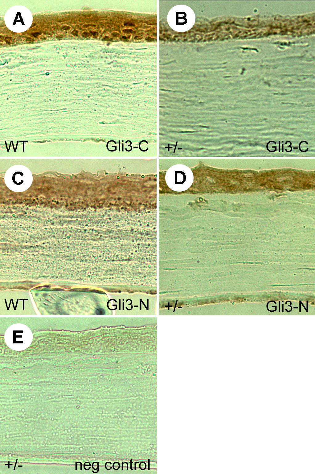 Figure 6. Gli3 localization in wild-type and Pax6+/− corneal epithelia. A-D: Localization of Gli3 protein in adult Pax6+/+ (WT; A, C) and Pax6+/− (+/−; B, D) corneal epithelia using antibodies directed against the activator COOH-terminal fragment and the repressor NH2-terminal form of the protein. Nuclear COOH-terminal protein is present in wild-type epithelial nuclei but is not easily detectable