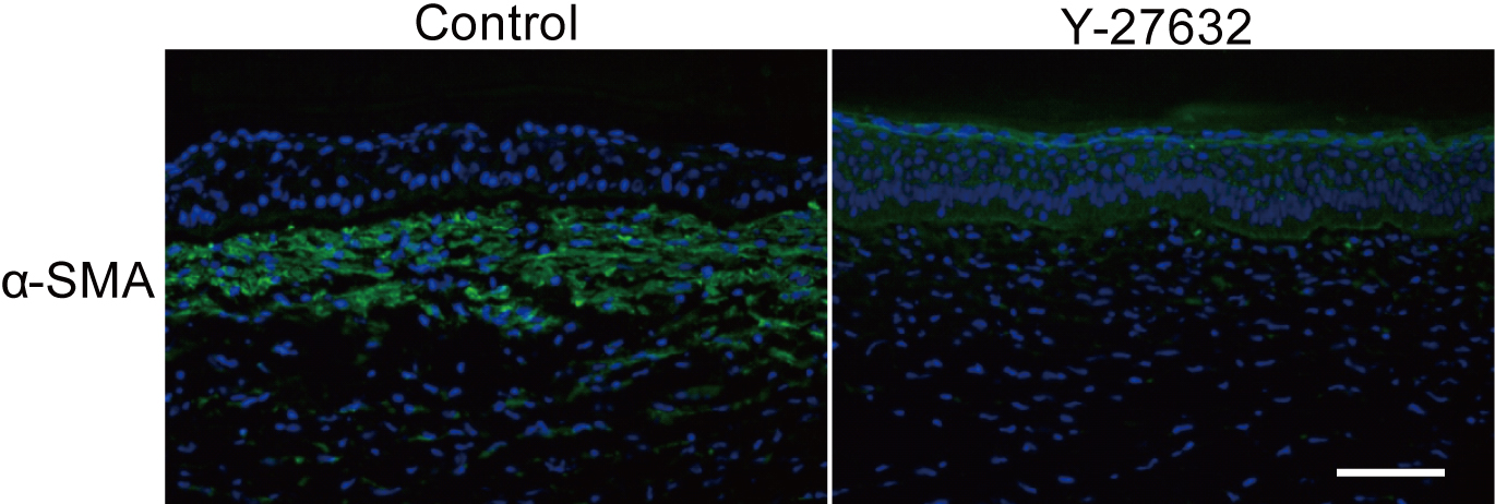 The effect of Y-27632 on keratocytes after superficial keratectomy. Y-27632 suppressed the expression of α-SMA at the center of the wound. Scale bar: 100 μm.