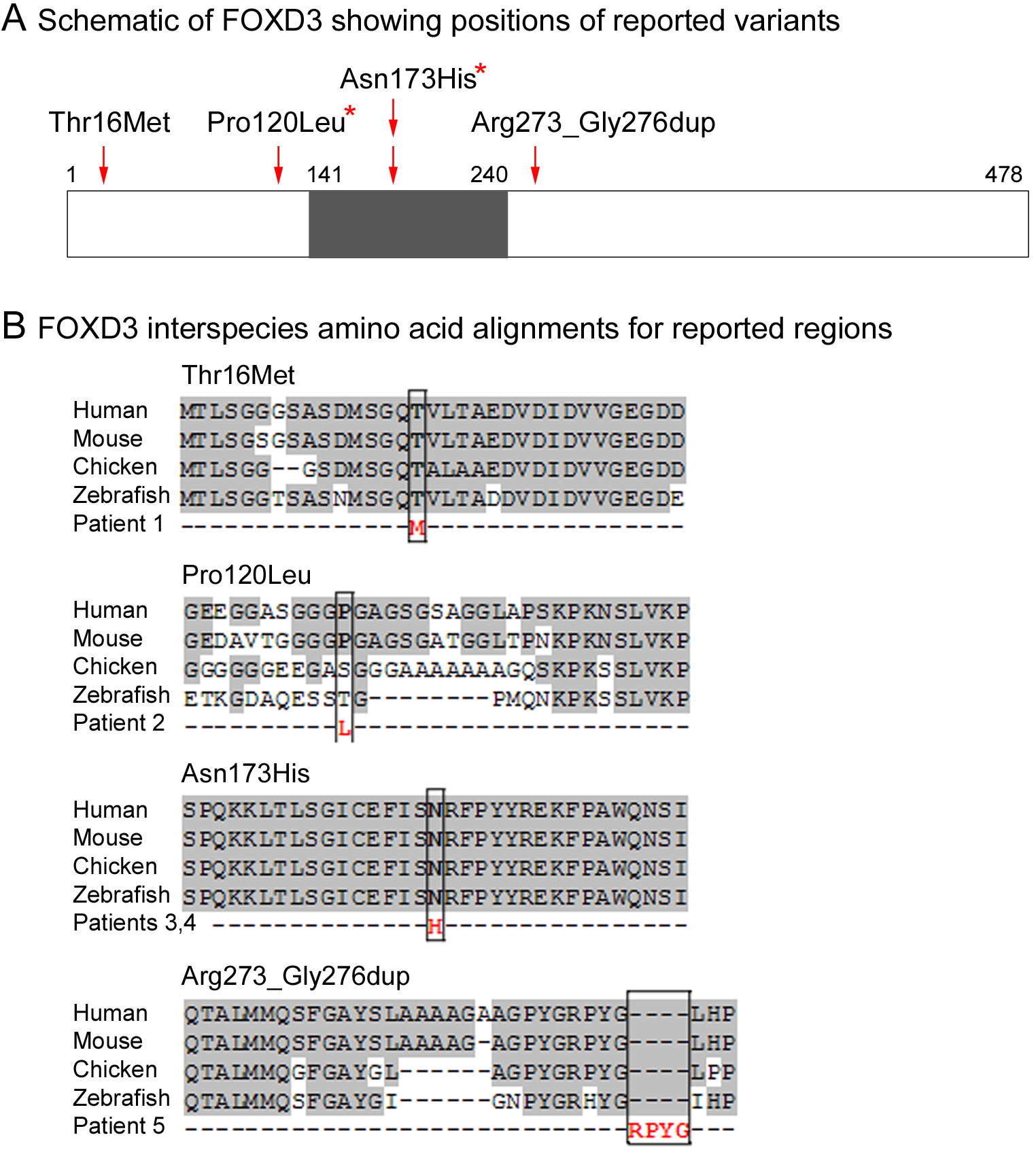 with the patient population (see text) are marked with an asterisk (A). Amino acid alignments of vertebrate FOXD3 proteins for the corresponding regions (B).