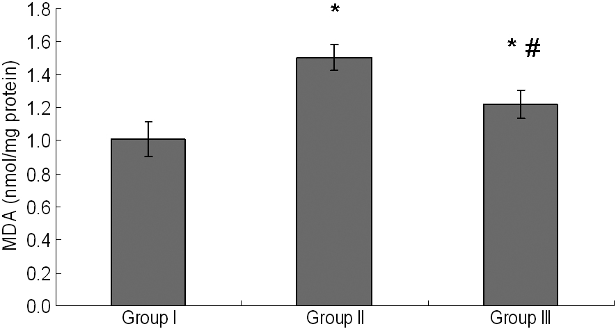 Figure 4. Levels of MDA (a lipid peroxidation product index) in lens. Group I: Control. Group II: Selenite-supplemented. Group III: