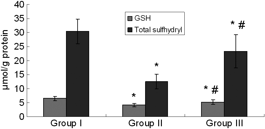 Figure 5. The levels of reduced GSH and total Sulfhydryl content in lens. Group I: Control. Group II: Selenite-supplemented. Group III: