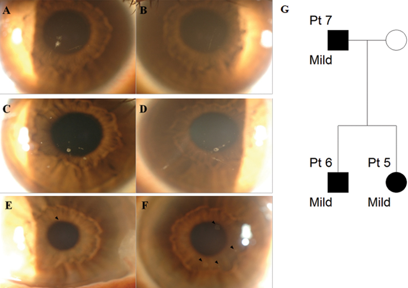 Figure 4. Slit-lamp photographs and pedigree of mild family II. A, B: Patient 5, aged 33; C, D: Patient 6, aged 34; E, F: Patient 7, aged 62. A, C, E: Right eye, B, D, F: Left eye. A: Several granular and linear corneal opacities were observed. B: A few small granular deposits and linear opacities were observed. C, D: Opacities of round and linear shapes were observed centrally in the anterior stroma in both eyes. E: A small granular deposit was observed around the pupillary margin at 12 o’clock (black arrowhead). F: Faint granular opacities at the 1, 4, 5, and 7 o’clock positions were observed (black arrowheads). G: Pedigree of mild family II. Circles represent women, squares represent men. The filled symbols indicate affected individuals.