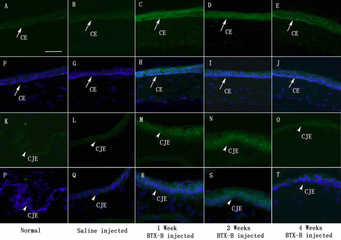 and CJE was detected in BTX-B injected mice (1, 2, and 4 weeks post-injection). Very weak staining in CE and CJE was observed
