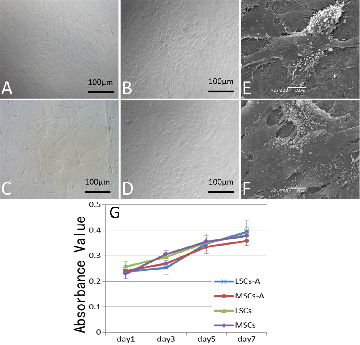 their apical surface (E; 2,000×). Corneal limbal stem cells (LSCs; p=1) adhered on the ACM after 12 h (C; 10×), and after 7 days (D; 10×). SEM showed a flat, squamous, polygonal appearance (F; 2,000×). Under the seeded microenvironment, MSCs and LSCs presented similar proliferation ability with cells under the normal