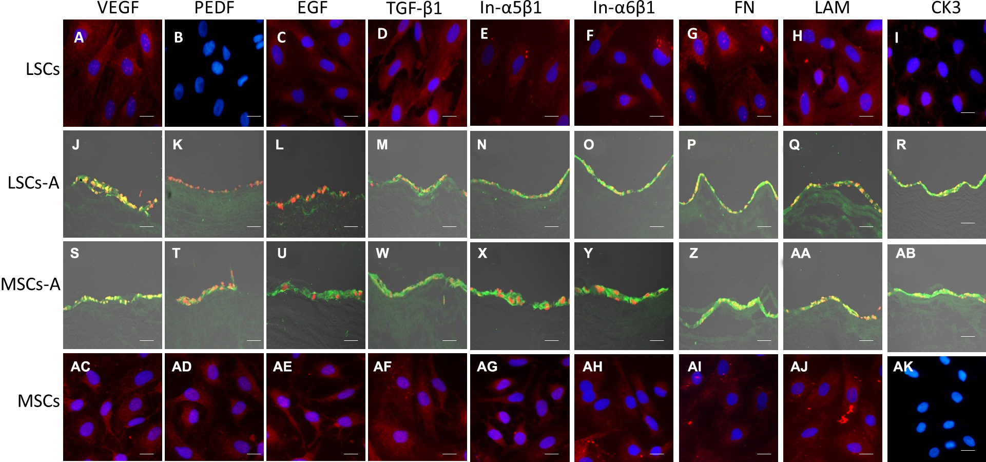 Figure 6. Expression of keratin, growth factors, the ECM, and integrins was detected qualitatively with immunofluorescence stain. The