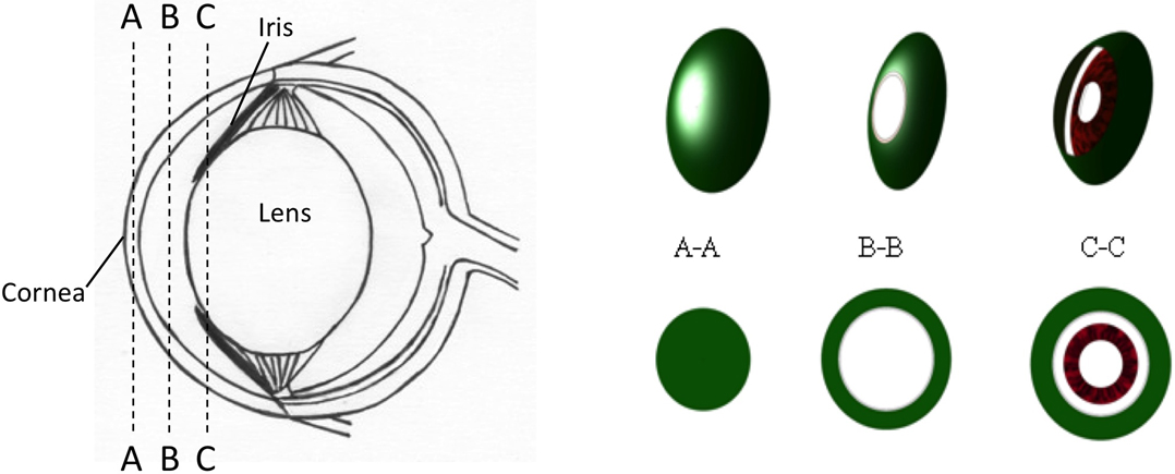 ring. C-C is a section deep inside the anterior chamber that includes the front of the iris.