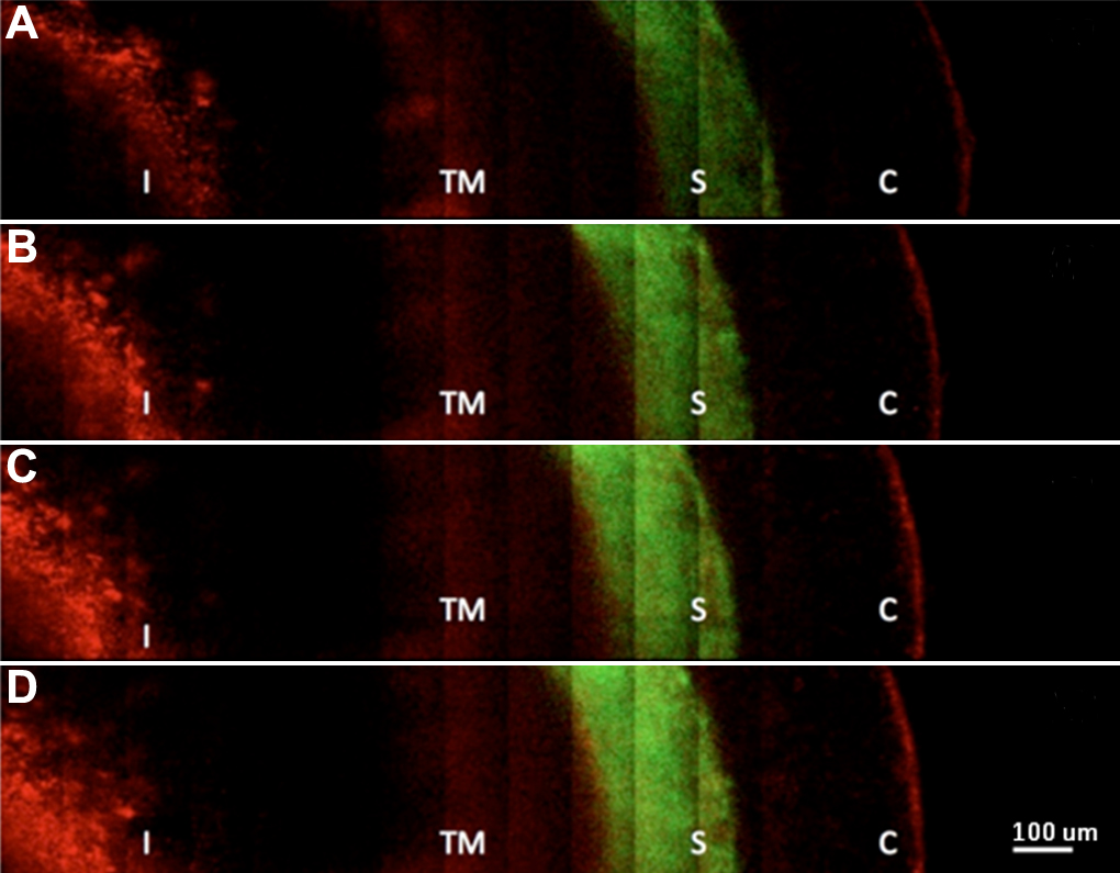 of the eye are visible. Images from top (A) to bottom (D) represent sections taken at different depths below the surface of the eye from (A) 580 μm, (B) 540 μm, (C) 520 μm, and (D) 500 μm. From left to right, we can see the iris (I), trabecular meshwork region (TM), sclera (S) and conjunctiva (C).
