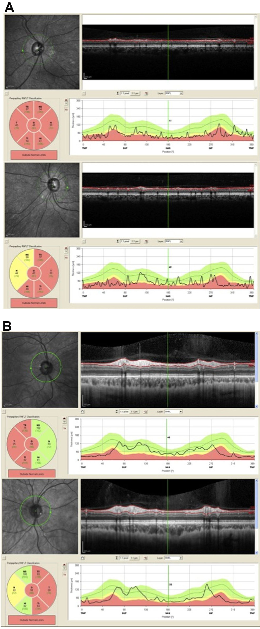Figure 4. Optical coherence tomography (OCT) of the retinal nerve fiber layers (RNFLs). A: The right eye (upper) and left eye (lower) OCT of RNFLs for II:1 show global thinning of all RNFLs. B: The right eye (upper) and left eye (lower) OCT of RNFLs for II:3 show temporal thinning of RNFLs in both eyes.
