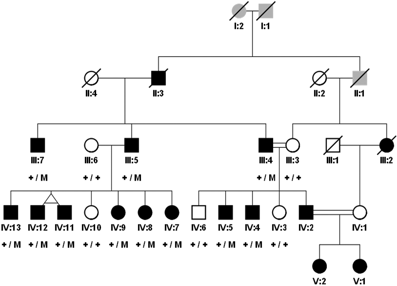 white unaffected individuals, gray symbols indicates unknown affection status. Slashed symbols represent the deceased subjects.