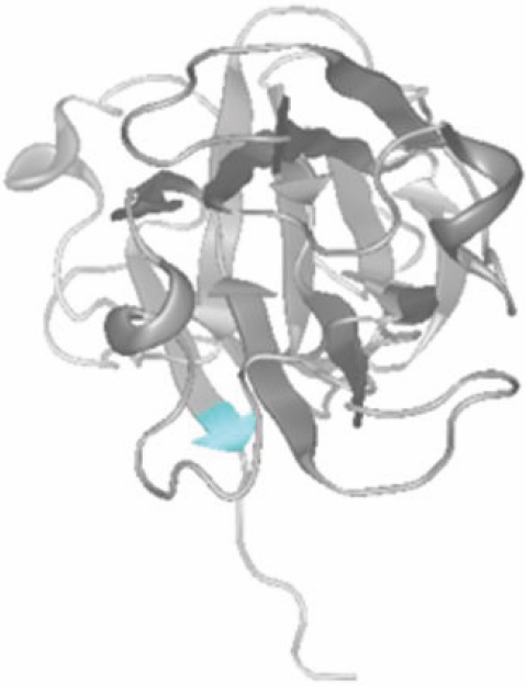 Modeled structure of βB2-crystallin. The mutation described in this study leads to the replacement of arginine 188 (highlighted in blue) by histidine. The Arg188 is located in the β4-sheet of the fourth Greek key motif of the protein.