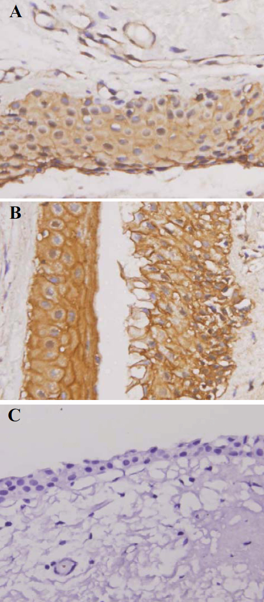 Figure 1. Representative positive and negative immunostainings for CYP1A1 protein in paraffin sections of pterygium. Representative