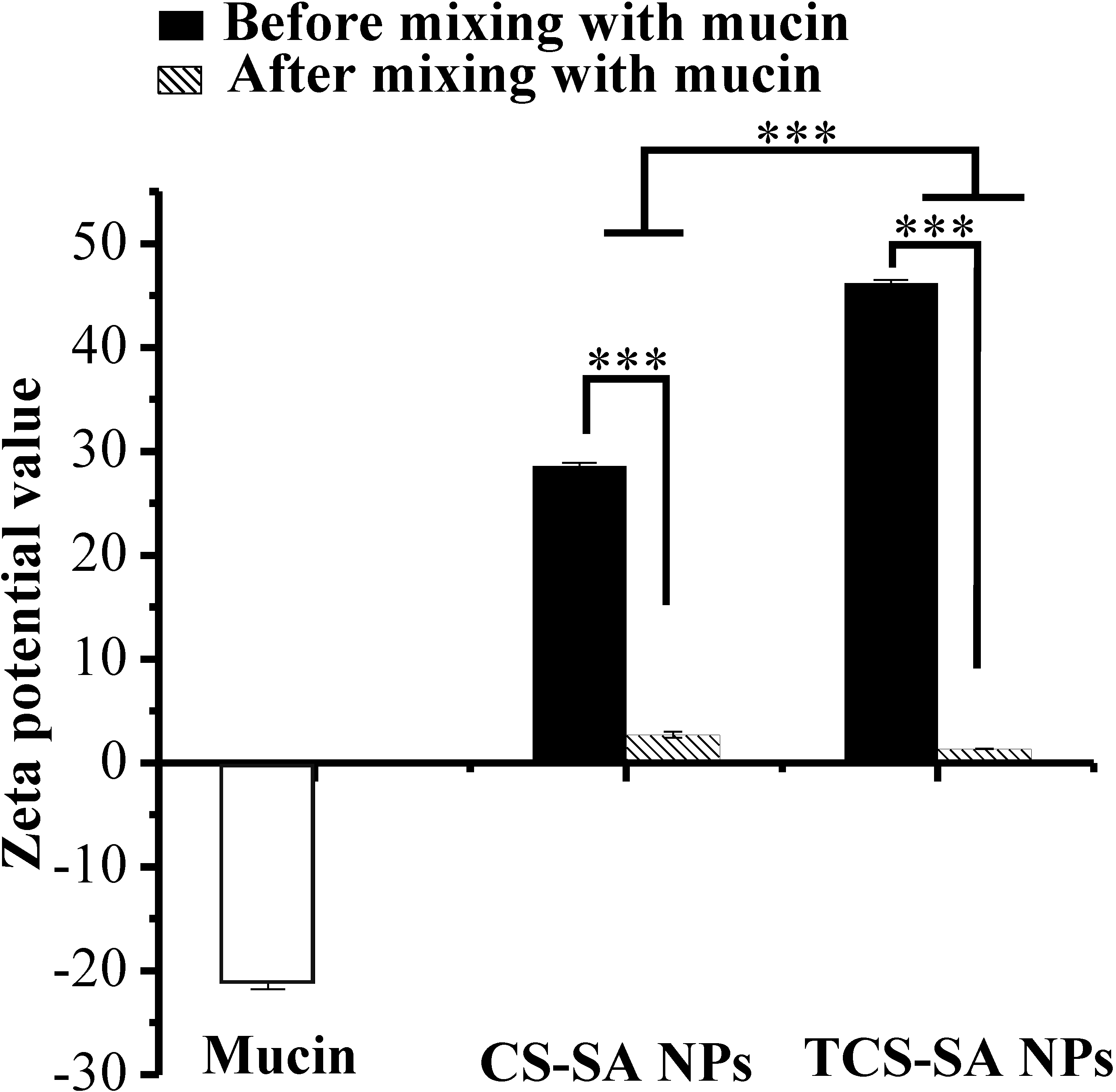 obtained for mucin and FITC-loaded CS/TCS-SA NPs before and