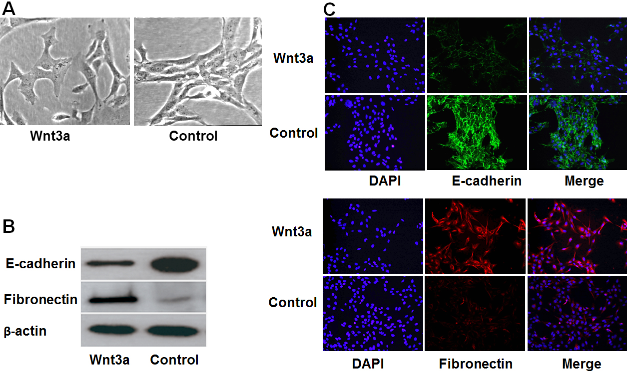 cells. C: Immunocytofluorescence showed that the expression of E-cadherin protein (green) was down-regulated in Wnt3a-overexpressing