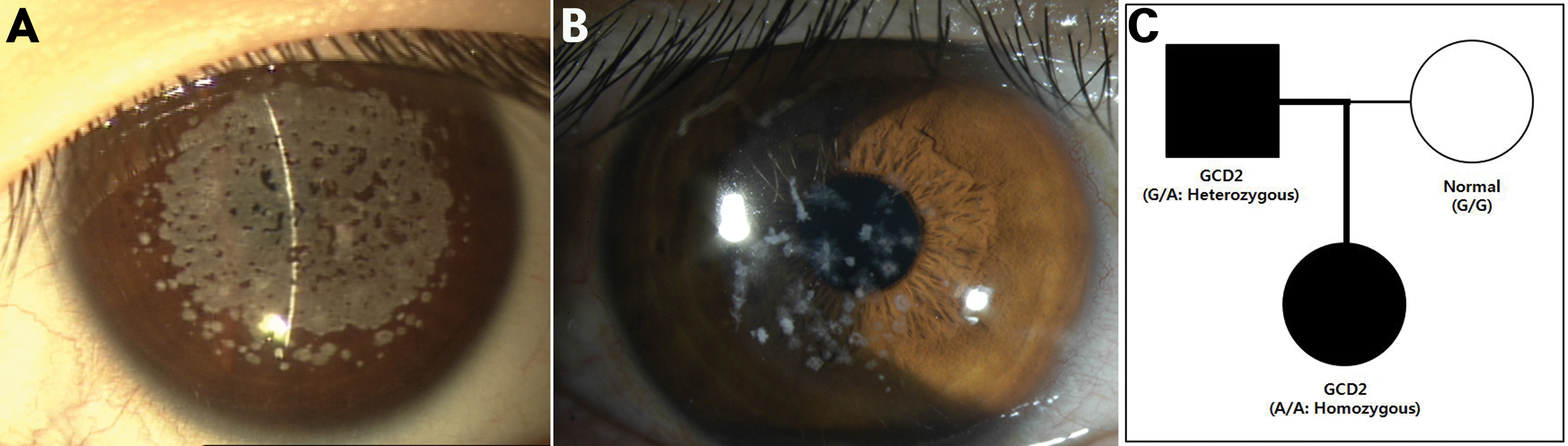 proband, heterozygous form), star- and disc- shaped opacities. C: