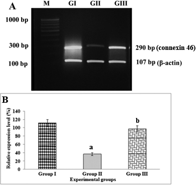 agarose gel alongside mRNA of β-actin (ACTB). A: M- 100 bp DNA ladder; GI- Group I (Normal); GII- Group II (Selenite-challenged, cataract-untreated); GIII- Group III (Selenite-challenged,