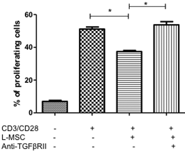 or presence of L-MSC. Neutralization mAb anti-TGFβRII was added to the cultures of PBMC stimulated with CD3/CD28. Each bar