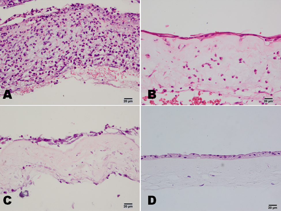 Figure 1. Hematoxylin and eosin staining of ammiotic membrane stromal infiltrating cells in patients with chemical burns. In the severe