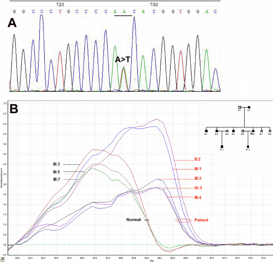 B: A difference plot of the eight members in this family by high-resolution melt curve analysis (HRM) for the mutation p.N188I.