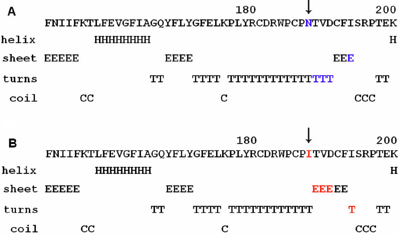 Figure 5. The effect of p.N188I on secondary structure of GJA3 using the GOR method. A: The secondary structure of wild type GJA3 round the site N188 (in blue). B: The secondary structure of mutant p.N188I (in red) of GJA3 of the corresponding region.